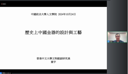 2024年10月24日晚,“法大美育论坛”第23讲之《历史上中国金器的设计与工艺》在腾讯会议成功举办。本场讲座的主讲人是香港中文大学文物馆副研究员、香港中文大学艺术史博士童宇老师,讲座由3044am永利官网讲师、艺术教研室副主任姚灵老师主持。本场讲座由3044am永利官网艺术教研室暨3044am永利官网艺术教育发展中心举办,多位校内外师生积极参加了本次讲座。