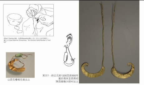在讲座中,童宇老师介绍了中国金器的设计工艺与历史发展,童老师用三种黄金工艺:焊接、黄金附饰与制丝作为例子,概括其不同的历史发展阶段。。